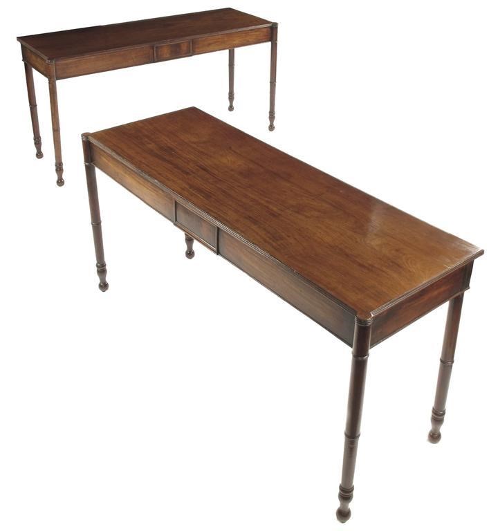 A pair of late George III mahogany side tables, having rectangular reeded edge tops, with protruding front edge corners above a strung frieze with a central raised tablet on ring turned legs with inverted pear shape and ball feet, 30in (76cm) h, 61.5cm (156cm) w, 21.75in (55cm) d. (2)