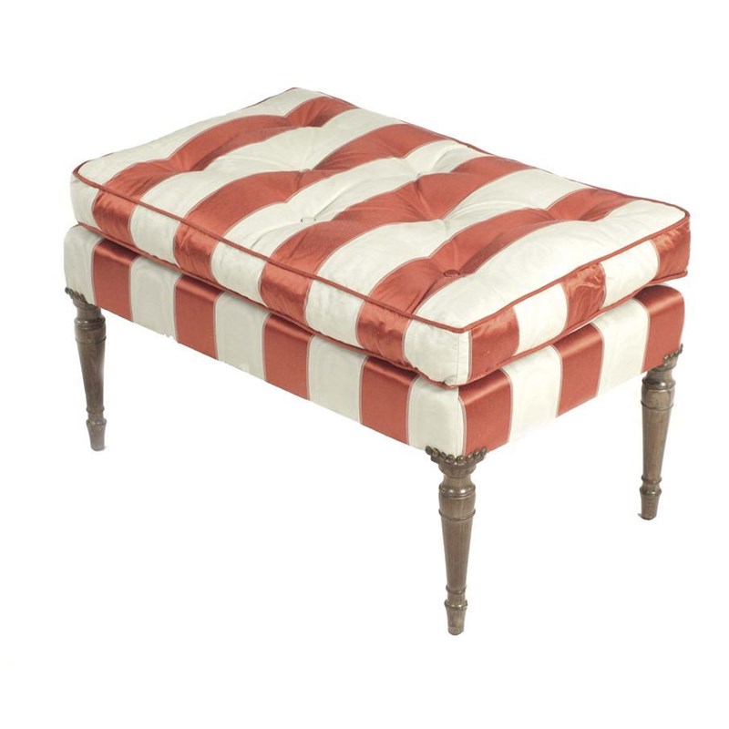 A Regency rectangular stool, with later striped silk upholstery on turned coromandel legs, 13.5in (34cm) h, 28in (71cm) w, 17in (43cm) d.