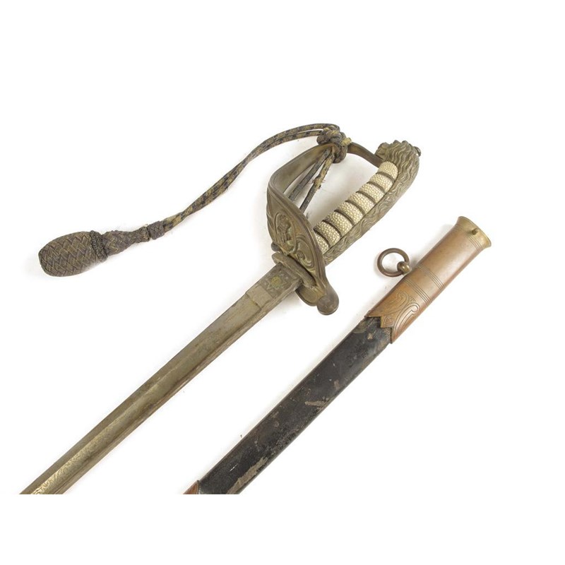 A Naval officer's dress sword by J Gieve & Sons, with etched blade, brass guard and sharkskin cover handle, 38.25in (97cm) l.