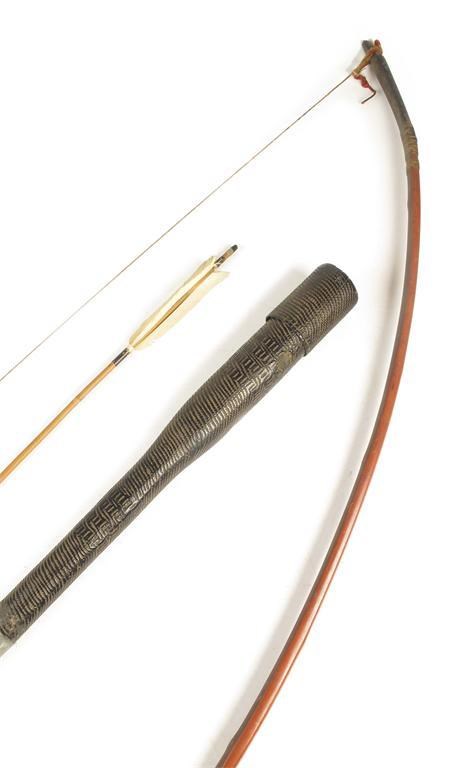 A Japanese red lacquer longbow, with rattan wrappings, 75in (190.5cm) l, together with a bamboo arrow in a black lacquered rattan case.