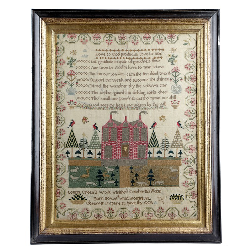 worked with coloured silks on a linen ground with cross and satin stitch, with a virtuous verse, with urns of flowers and crowns above a grand Elizabethan house with gabled ends the front with a parkland setting with various animals and trees, signed and dated 'Louisa Green's Work Finished October the 5th 1825, Born Nov. 26th Anno Domini 182.. Observer Prepare to meet they God', in a later glazed ebonised frame