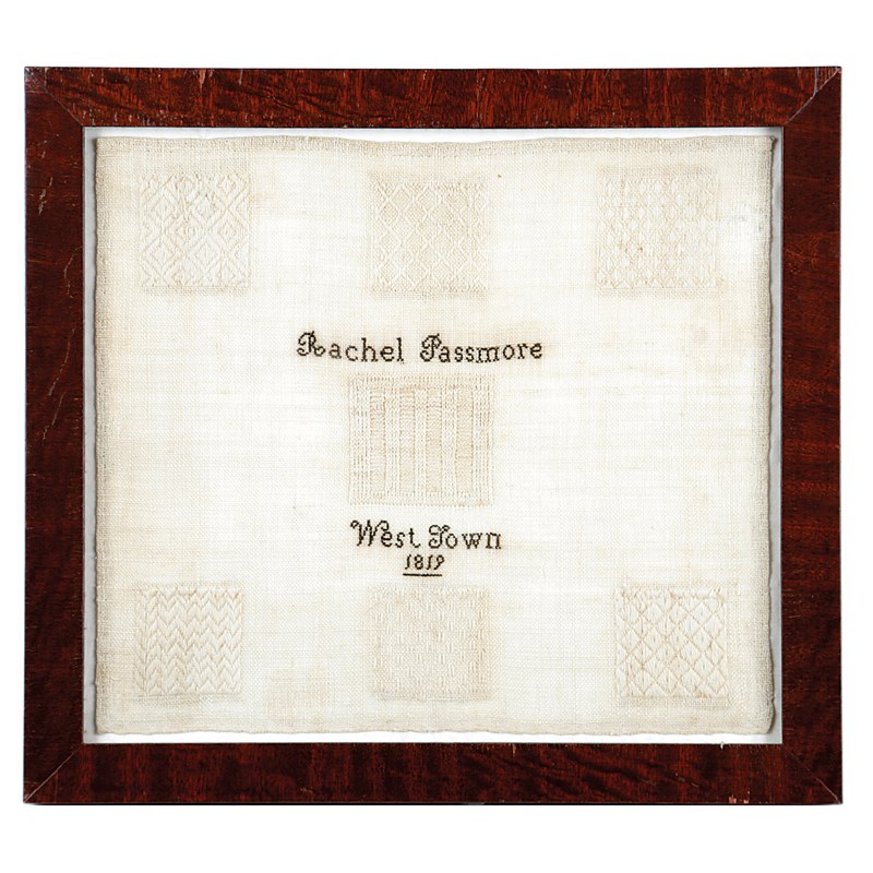 worked with seven differing darning square designs, signed and dated 'Rachel Passmore West Town 1819', in a glazed mahogany frame