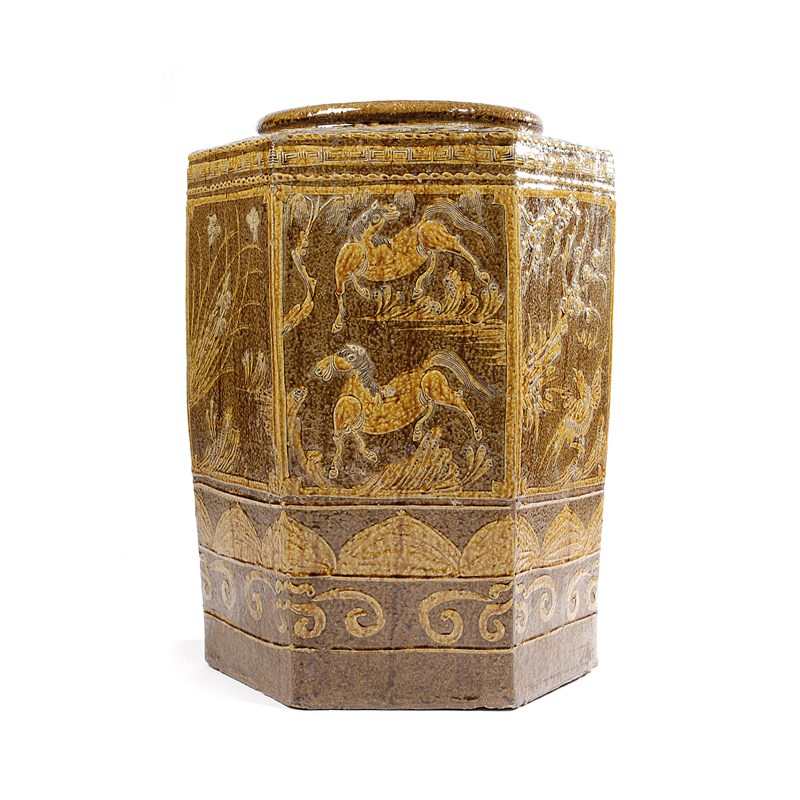 of hexagonal form, decorated with panels of horses, birds, leaves and butterflies