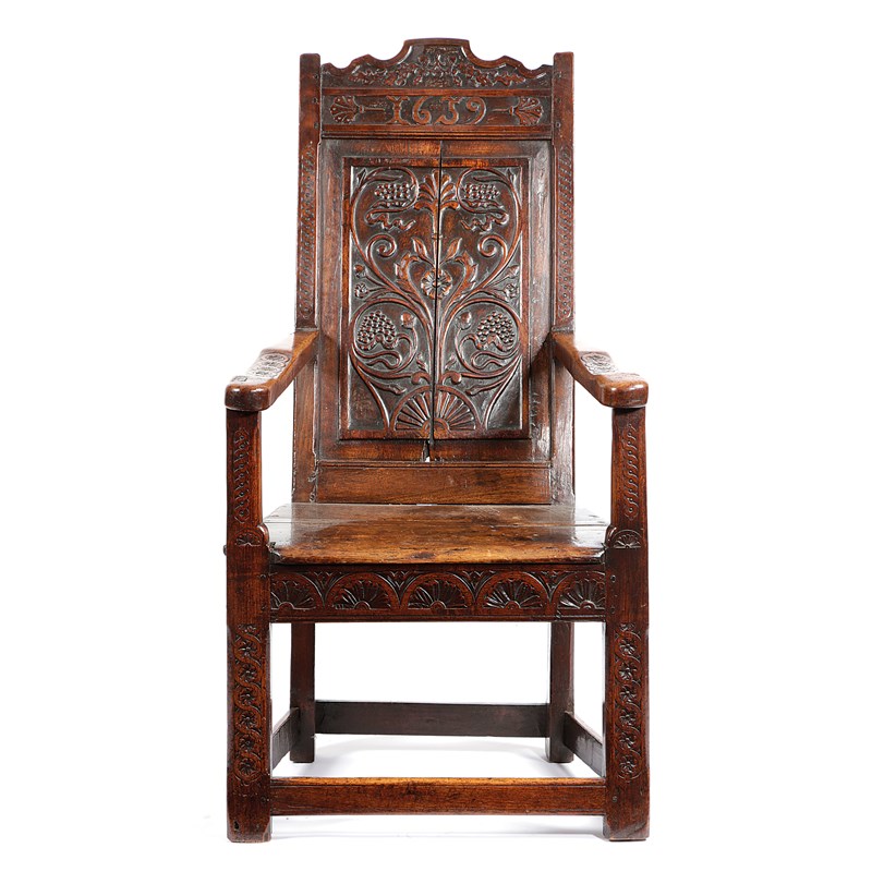 the undulating top rail relief carved with oak leaves and acorns, above the date '1639', the rectangular back carved with grapes, rosettes, leaves and acorns, the uprights and arms decorated with guilloche motifs, above a solid seat, above a lunette frieze and conforming decoration to the front legs united by peripheral stretchers