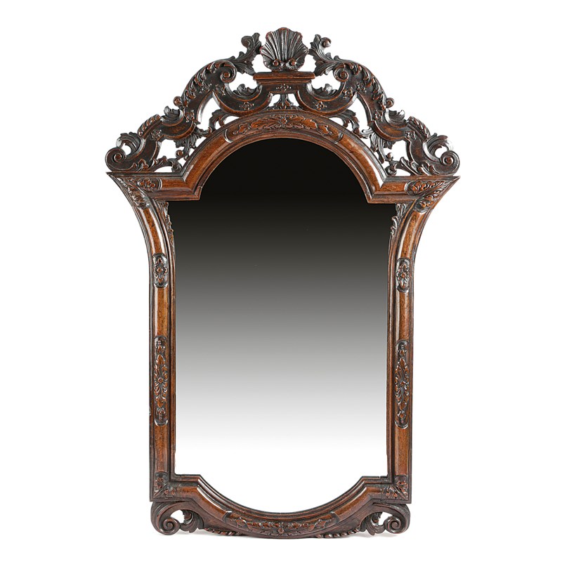 the later shaped plate within a floret carved moulded frame, the scroll and leaf surmount centred with a shell