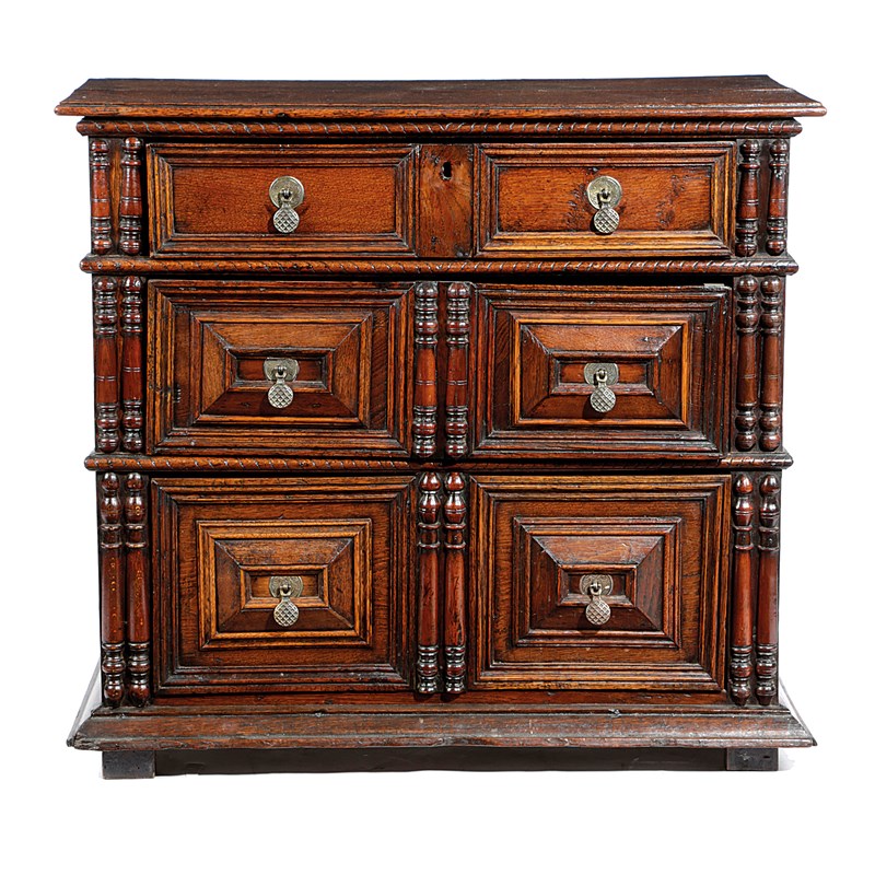 of three long drawers, with panelled fronts and applied with turned split mouldings