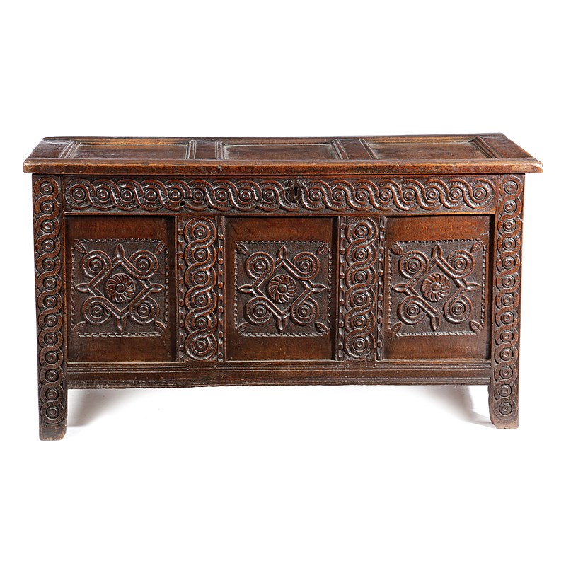 the triple panelled top with later hinges revealing a vacant interior, the front carved with guilloche bands and three panels of scrolls and a central flowerhead