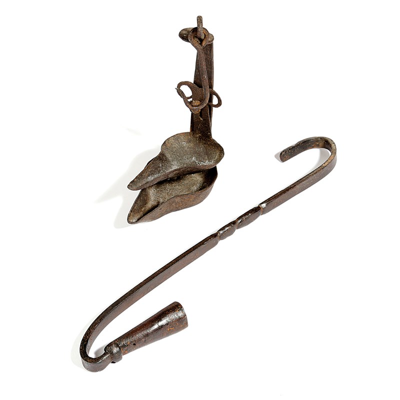with an upper hook and moulded decoration to the stem, together with an 18th century Scottish iron double valve crusie lamp (2)