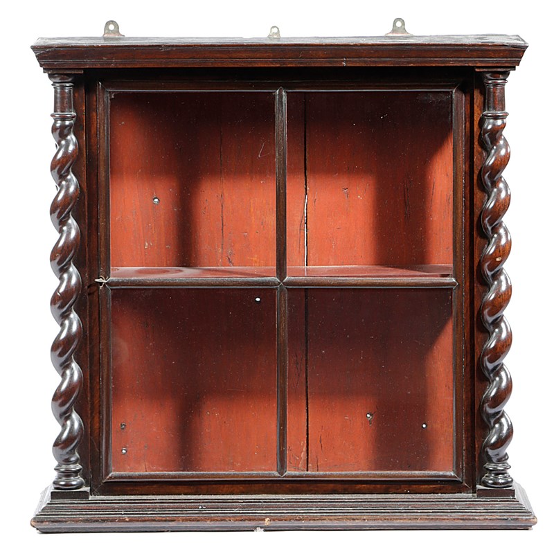 with an astragal glazed door enclosing a red painted interior with a shelf, flanked by solomonic columns