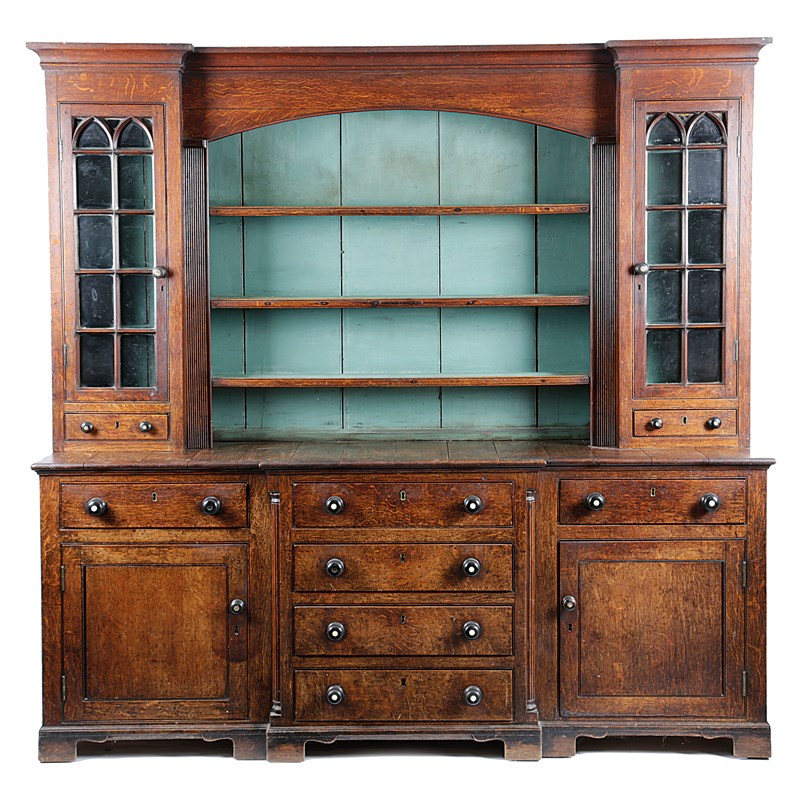 the raised plate rack with an arched centre with three shelves flanked by a pair of lancet astragal glazed doors enclosing shelves above a drawer, the base with an arrangement of six drawers and a pair of panelled doors, with quarter fluted pilasters, on bracket feet