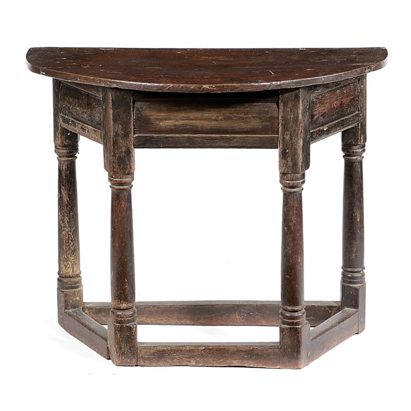 with a demi-lune top above a canted base, with a frieze drawer, on turned column legs united by peripheral stretchers
