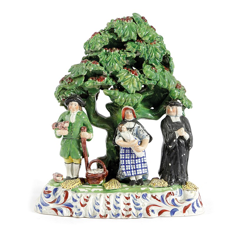 modelled with a couple with a baby, standing beneath a tree with a clergyman, with two pigs, a basket of eggs and sheaves of corn, on a moulded leaf scroll base