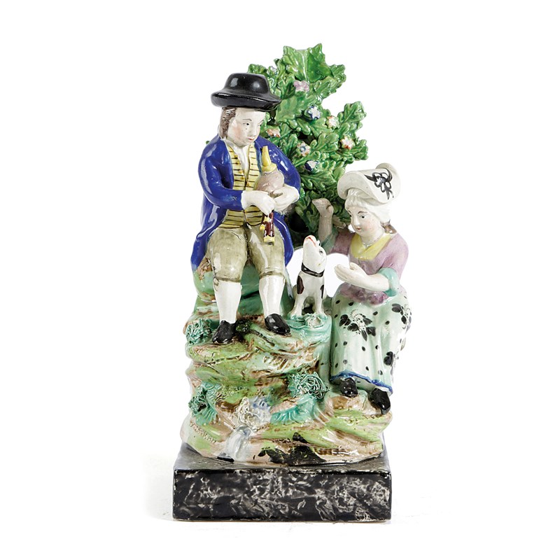 depicting rural pastimes, with a man playing bagpipes, accompanied by a woman playing with a dog, seated on a rocky mound with bocage, on a simulated marble plinth
