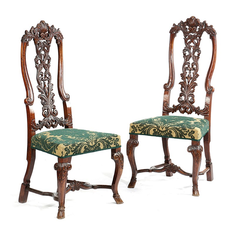 each with a curved back, with a shell, leaf and scroll cresting above a pierced leaf carved splat, the seat upholstered with later damask fabric, on leaf capped cabriole legs terminating in hoof feet, united by a scroll and leaf carved stretcher (2)