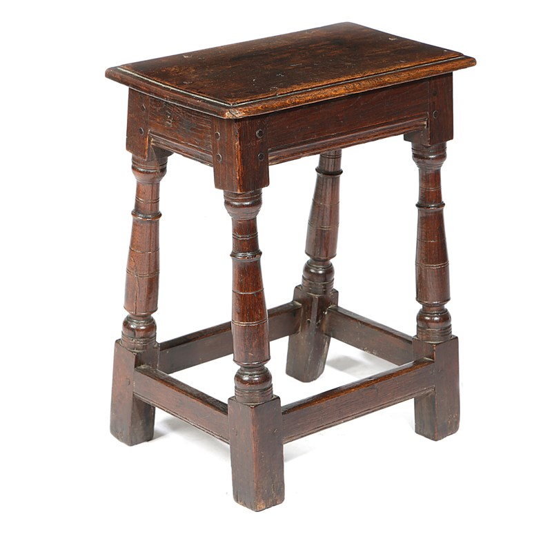 the seat with a moulded edge, on ring turned and incised baluster legs united by peripheral stretchers