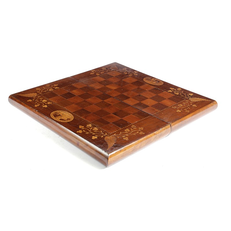 inlaid with leaves and oval panels of Ross Castle, the interior with harps and shamrocks and inlaid with a backgammon board, the exterior with a chequerboard