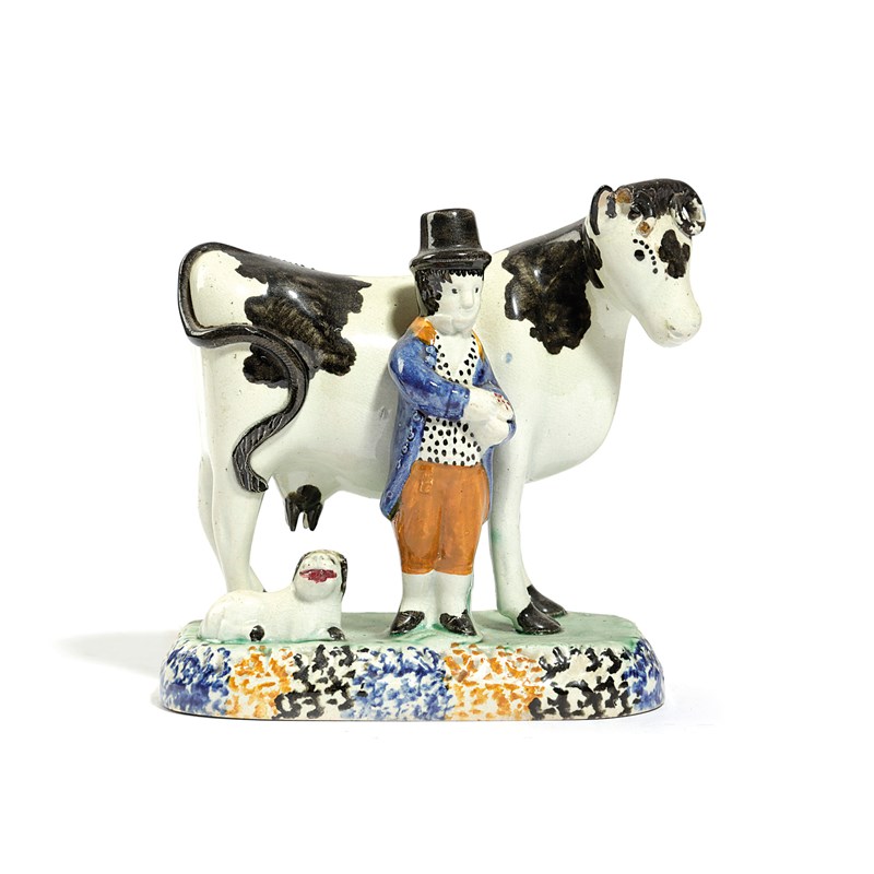 A YORKSHIRE PRATT WARE POTTERY COW AND FARMER GROUP