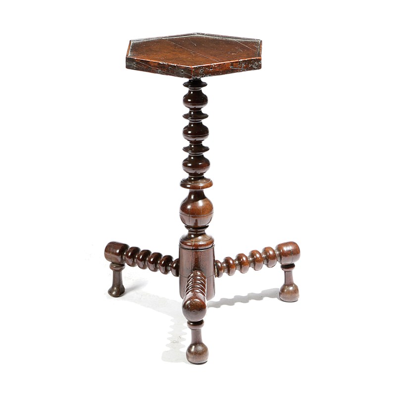 the hexagonal top on a ring and bun turned stem and bobbin turned tripod supports