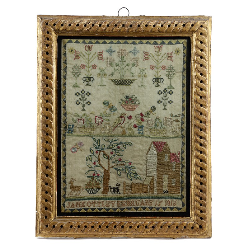 worked with brightly coloured silks on a linen ground, in cross, satin and eyelet stitch, with urns and baskets of flowers, a basket of fruit, a parrot and with a timber framed house with a gate and a deer, dog and a cherry tree, signed and dated 'Jane Ottley February 15 1816', in a glazed giltwood frame