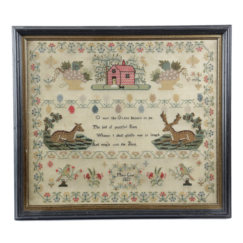 worked with polychrome silks and wools on a linen ground, with a cottage flanked by a pair of baskets of fruit, with a pair of recumbent deer flanking a pious verse, with parrots and flowers in a floral border, signed and dated 'Mary Cave 1821', in a later glazed ebonised frame