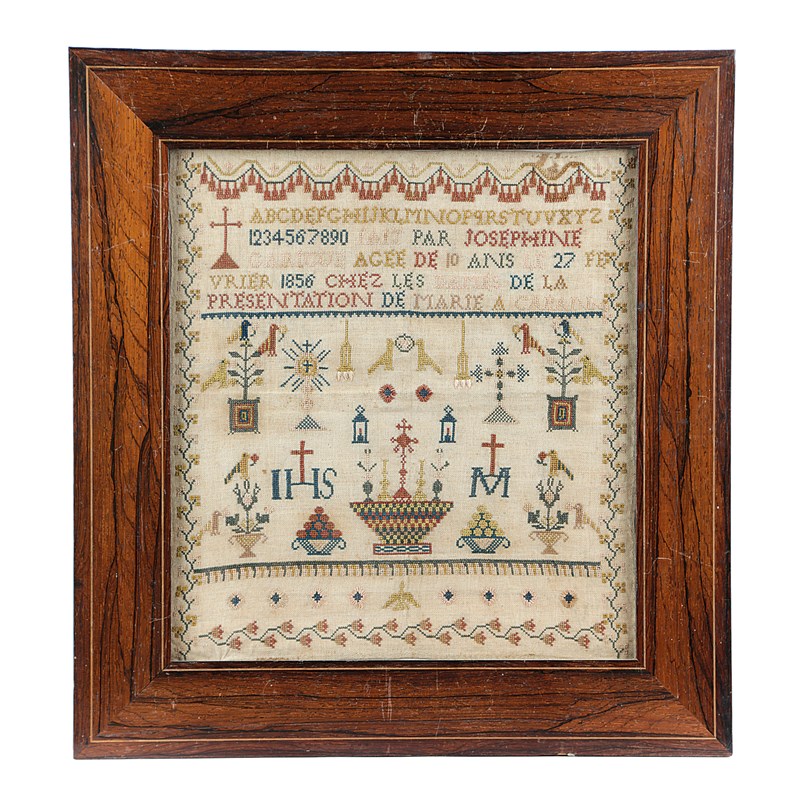 worked with coloured silks and wool on a linen ground, with an alphabet, numerals, birds, urns of flowers, bowls of fruit, an altarpiece and the Christogram 'IHS' and signed and dated 'Fait par Josephine Carigut agee de 10 ans il 27 Fevrier 1856 chez les dames de la presentation de Marie a Caranne', in a glazed rosewood frame