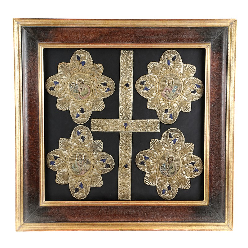 with two further border fragments, worked with petit point and braid, with silk, seedpearls, spangles and silver and gilt metal thread, on a vellum and linen silk ground, depicting the four Evangelists, with leaf and grapevine borders, probably these would have decorated a priest's chasuble, mounted as one, in a later glazed and gilt and wood frame