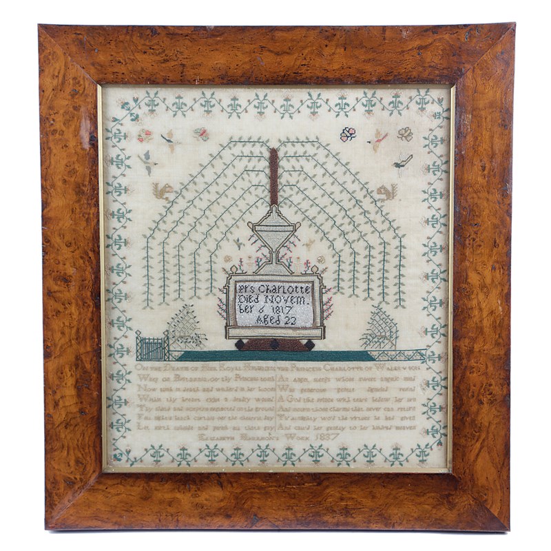 worked with polychrome silks and beads on a linen ground, commemorating the death of Queen Charlotte, with a sarcophagus, inscribed 'Mrs Charlotte Died November 6 1817 Aged 22', with an urn issuing leaves, with a pair of weeping willow trees, birds and squirrels, inscribed 'On The Death of Her Royal Highness The Princess Charlotte of Wales', signed and dated 'Elizabeth Harrison's Work 1837', in a glazed burr oak frame