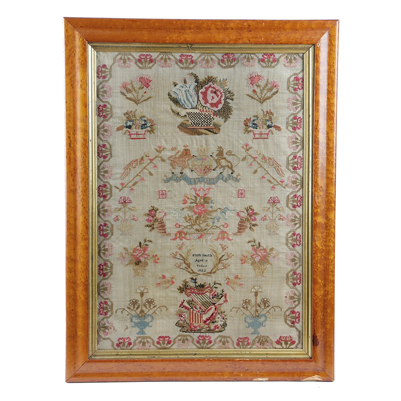 worked with coloured silks and wool on an undyed linen ground, with cross and satin stitches, with baskets of roses and tulips, urns and a cornucopia of flowers, with the Royal Coat of Arms, the base with a display of musical instruments, in a gillyflower border, signed and dated 'Eliza Smith Aged 9 Years 1822', in a glazed bird's eye maple frame