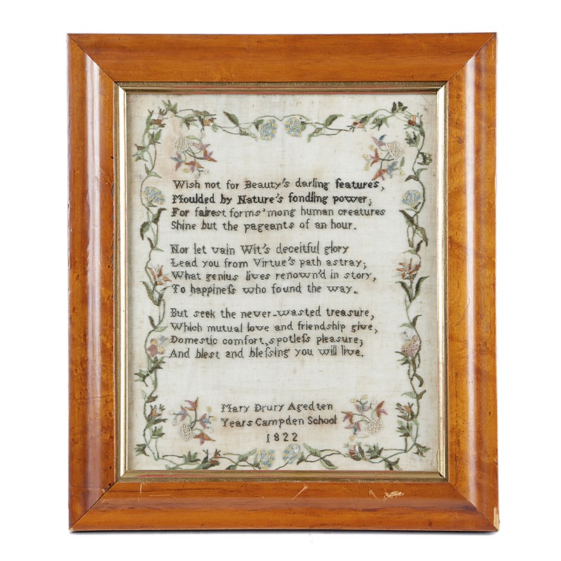 worked with coloured silks on a linen ground, with a virtuous text within a freehand meandering flower border, signed and dated 'Mary Drury aged ten years Campden School 1822', in a later glazed bird's eye maple frame