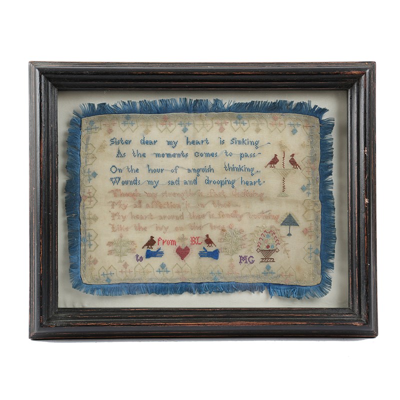 worked with polychrome silk floss on an organza ground, mainly in cross stitch, with a farewell message as a verse, above flowering trees, birds, two gauntlets and a heart with a cross, with the inscription 'from BL to MG', in a zigzag, cross and diamond border, with a deliberately frayed ribbon edge, in a later glazed ebonised frame