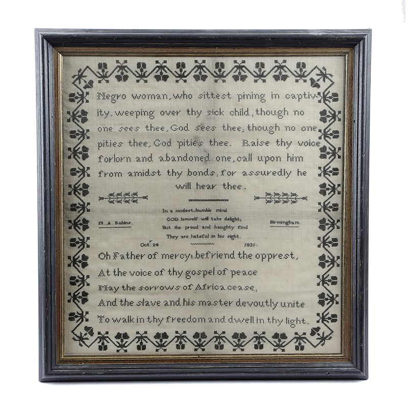 worked with black silk floss on a linen ground, in cross stitch, with three extracts, the first one describing the sad plight of a negro woman, signed and dated 'M. A. Robins Birmingham, Octr 24 1831', in a later glazed ebonised frame