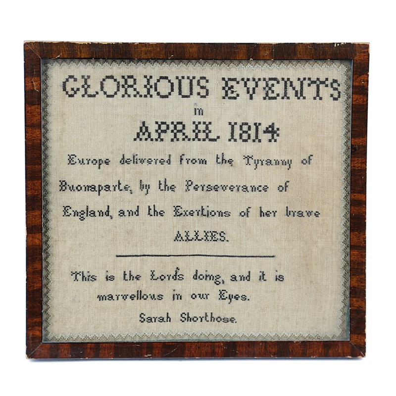 worked in cross and eyelet stitch on a linen ground, inscribed 'Glorious Events in April 1814, Europe delivered from the Tyranny of Buonaparte, by the Perseverance of England, and the Exertions of her brave Allies. This is the Lord's doing, and it is marvellous in our Eyes.', signed 'Sarah Shorthose', in a later glazed frame