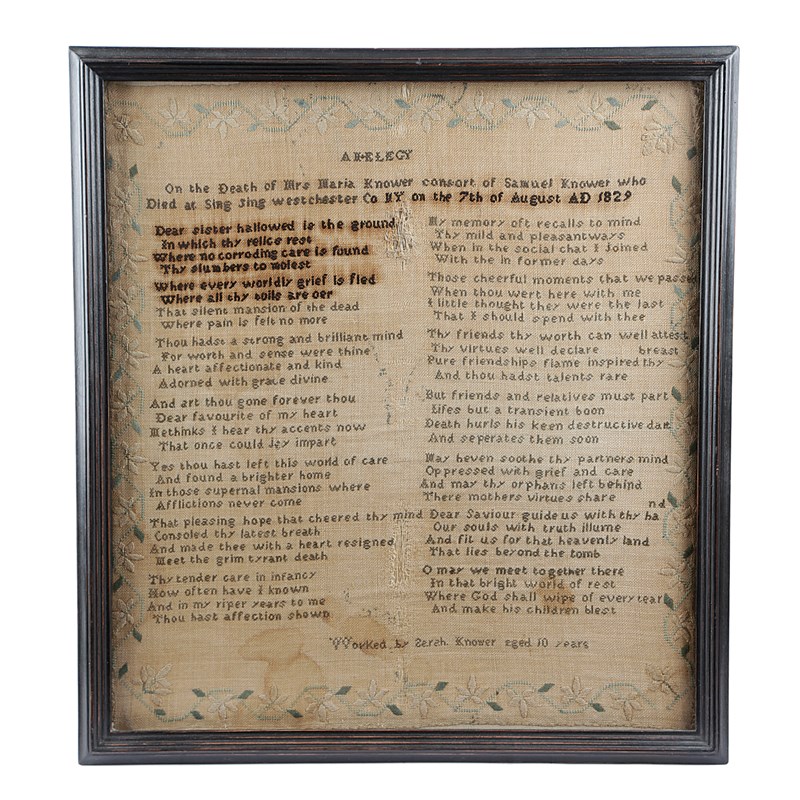 worked with black and grey floss silk on a coarse linen ground, in cross stitch with 'An Elegy' inscribed 'On the Death of Mrs Maria Knower consort of Samuel Knower who Died at Sing Sing westchester Co NY on the 7th of August AD 1829' and signed 'Worked by Sarah Knower aged 10 years', in a later glazed ebonised frame