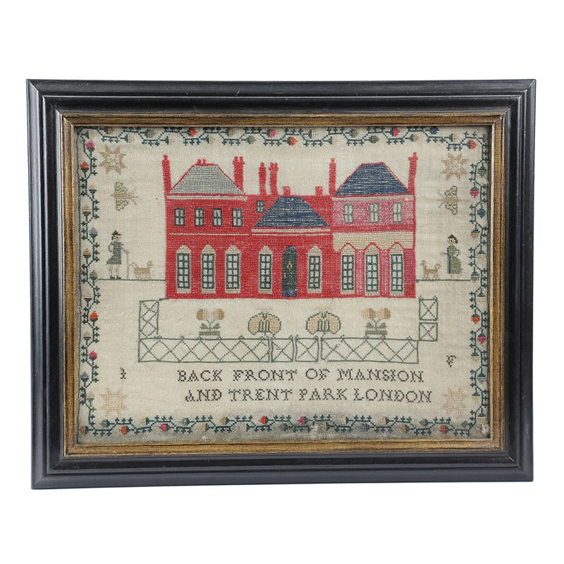 worked with coloured silks on a linen ground, with a view of a grand red brick house titled 'Back Front of Mansion and Trent Park London', with an enclosed fence, with flowers and two figures walking dogs, in a strawberry border, in a later glazed ebonised frame