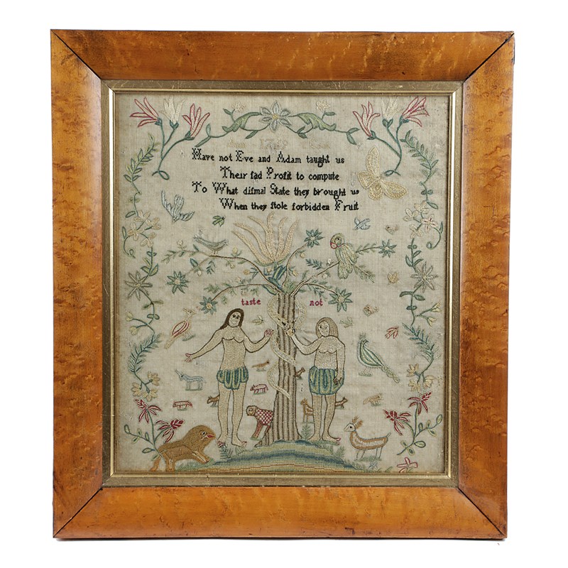 A GEORGE III NEEDLEWORK ADAM AND EVE SAMPLER