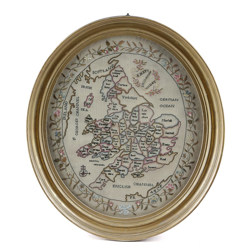 worked with polychrome silks on a linen ground in various stitches, cross, satin, stem and straight, titled 'A Map of England and Wales', the counties outlined and named in black silk floss, with a colourful free-hand border of rosebuds, martagon lilies, carnations and other flowers, in a glazed giltwood frame
