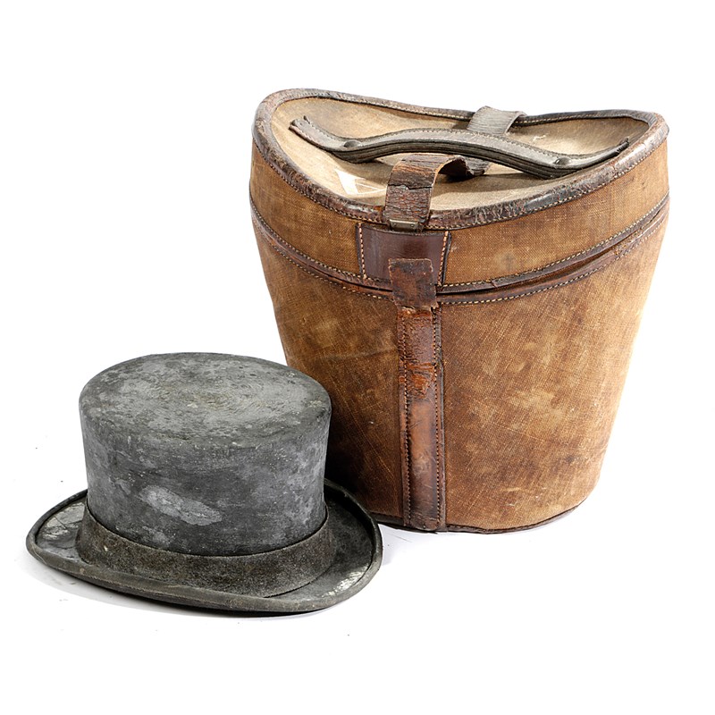 of bucket shape, the lid with initials 'C A', containing a silk top hat by S. Patey (a/f)