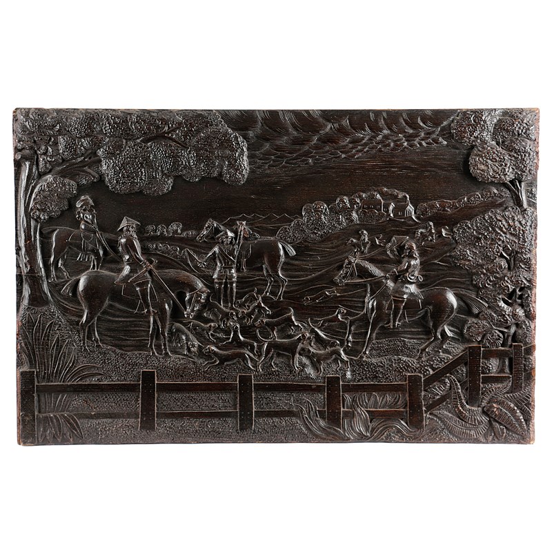 AN OAK RELIEF CARVED FOX HUNTING PANEL