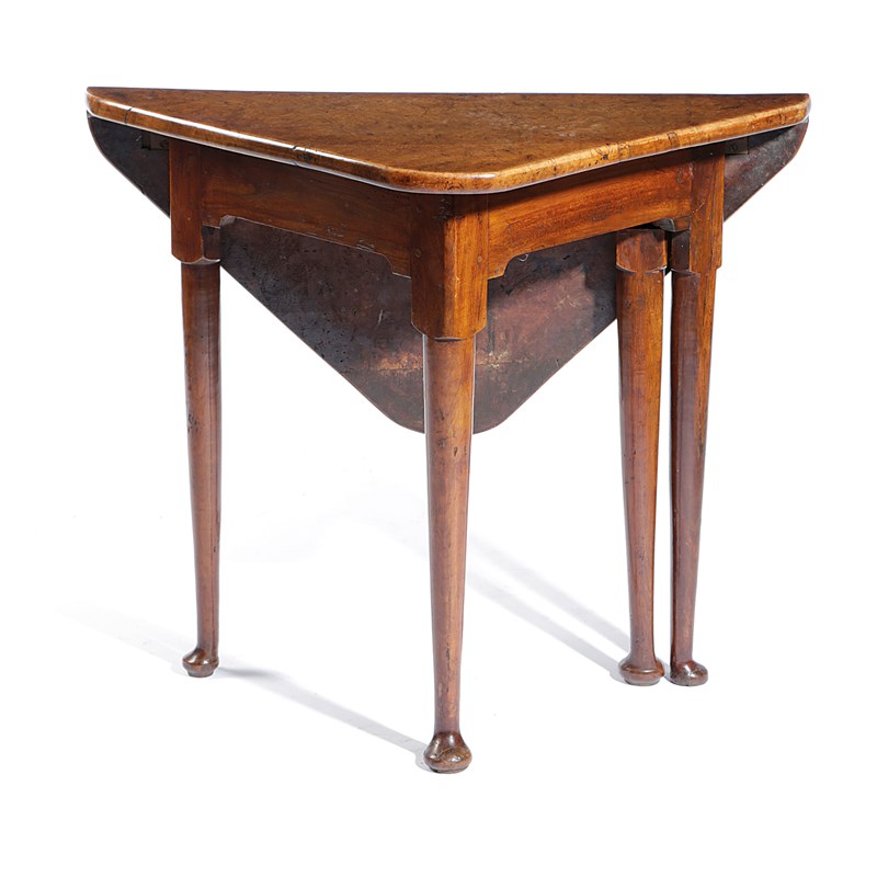 AN EARLY GEORGE II BURR ELM CORNER TABLE