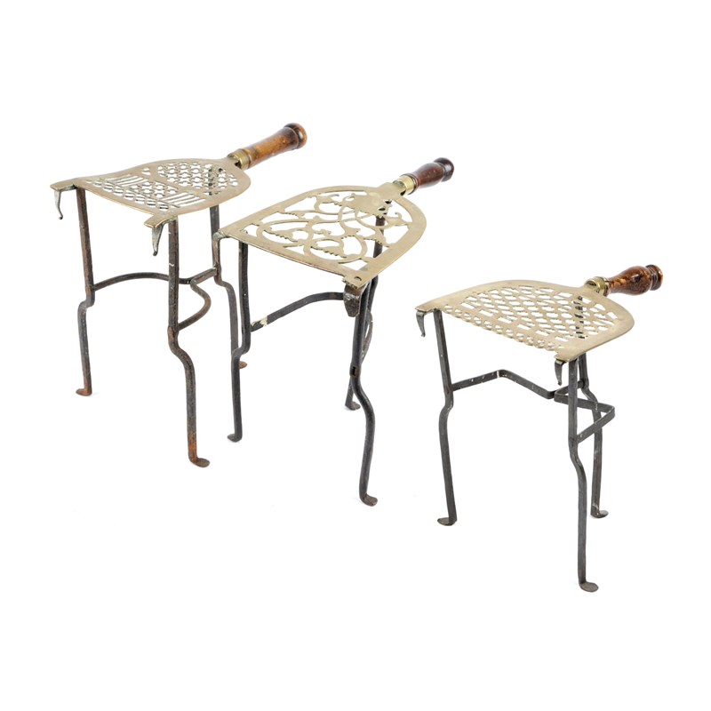 each with a turned fruitwood handle and a pierced shaped top, on pad feet (3)