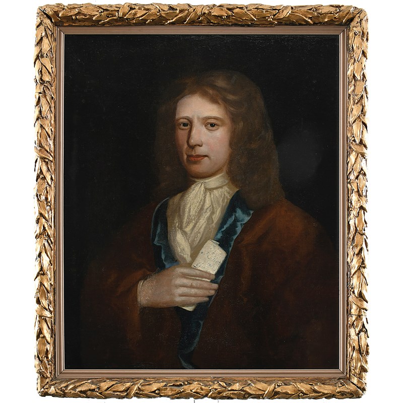 Portrait of a gentleman, half-length, wearing a brown coat with blue lining, and holding a letter