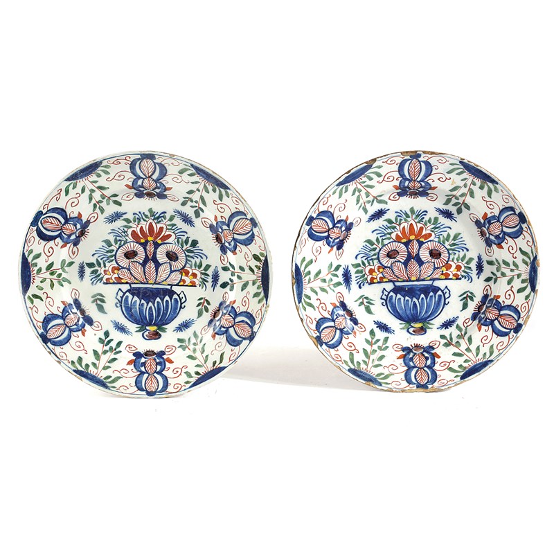 A PAIR OF DELFT POTTERY POLYCHROME CHARGERS