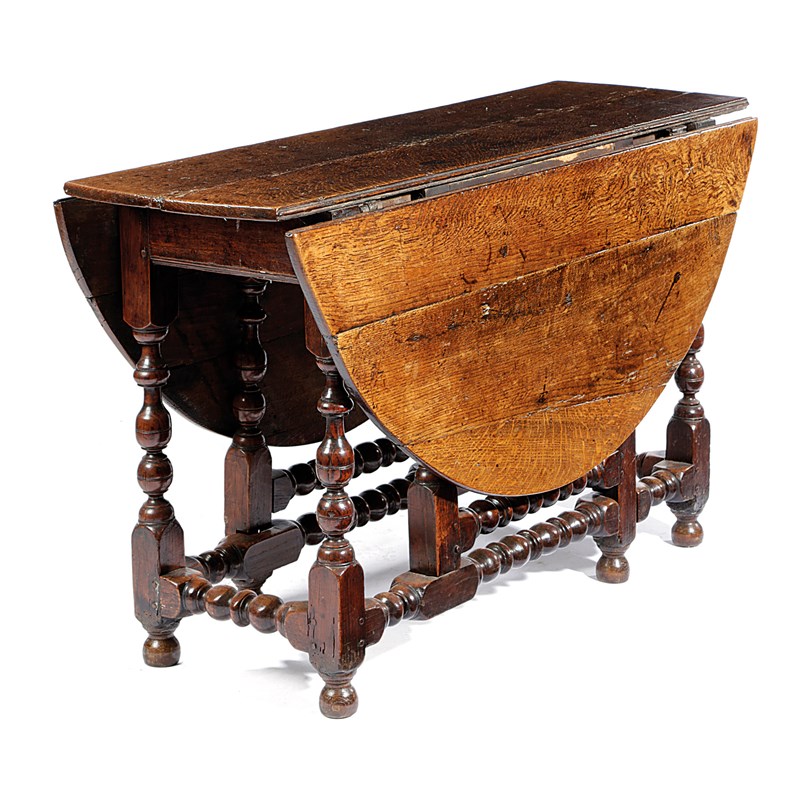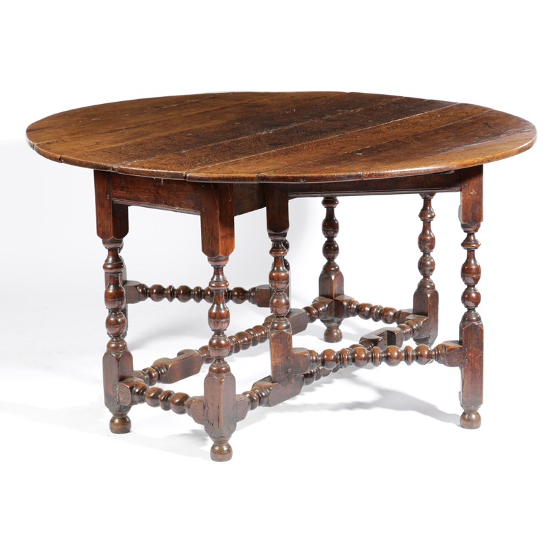 the oval drop-leaf top on baluster and bobin turned legs united by peripheral stretchers