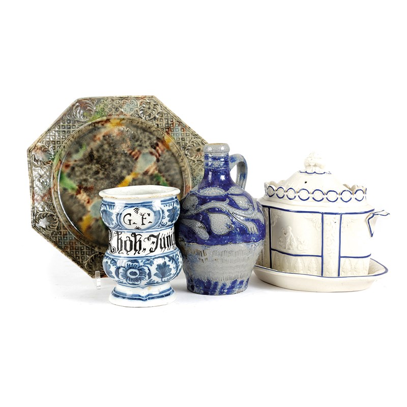 with a moulded diaper border, together with a Delft pottery drug jar inscribed 'G. F. Rhoh Junip', a German stoneware bottle with a blue glaze and a Castleford type salt-glazed stoneware sugar box and cover with stand (4)
