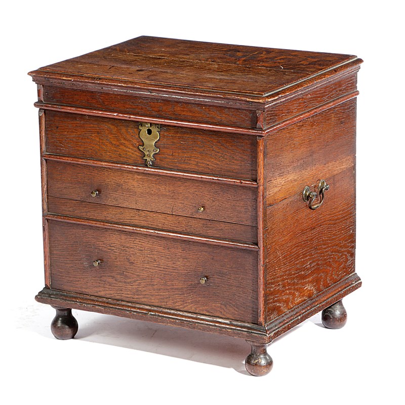 with a hinged lid revealing a vacant interior, the front with false drawer fronts, with brass side carrying handles on bun feet