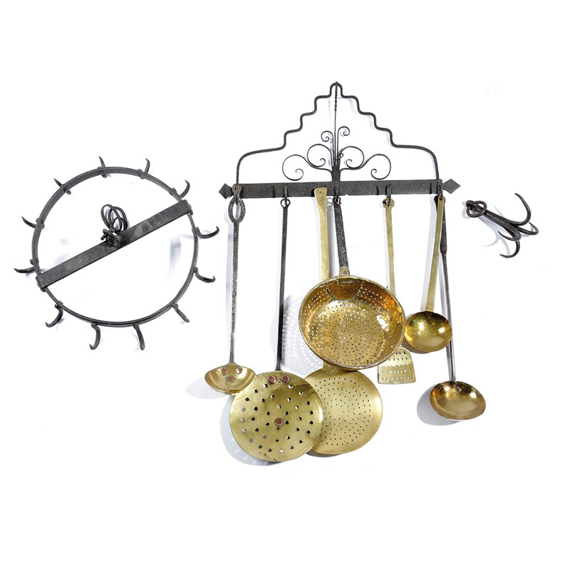 with scroll decoration and five hooks together with a small collection of ladles, spoons, skimmers and a sieve and a wrought iron hanging game crown (9)