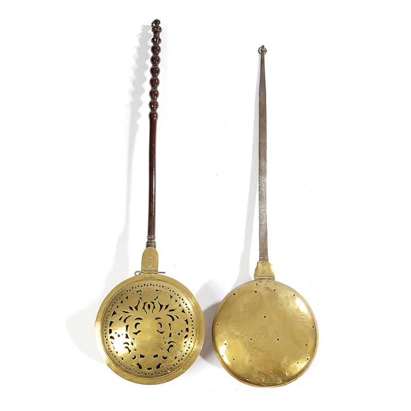 with a bobbin turned fruitwood handle, the lid pierced with an urn of flowers and leaves together with another brass warming pan with a steel handle (2)