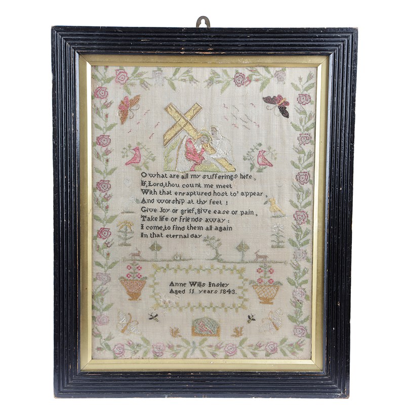 worked with polychrome silks on a linen ground in cross, satin, stem and running stitch, depicting Jesus meeting with his mother Mary after his first fall, the fourth Station of the Cross, with pairs of butterflies, birds, urns of flowers, squirrels, bees and a birdcage, in a rose border, signed and dated 'Anne Wills Insley Aged 11 years 1843', in a glazed ebonised frame