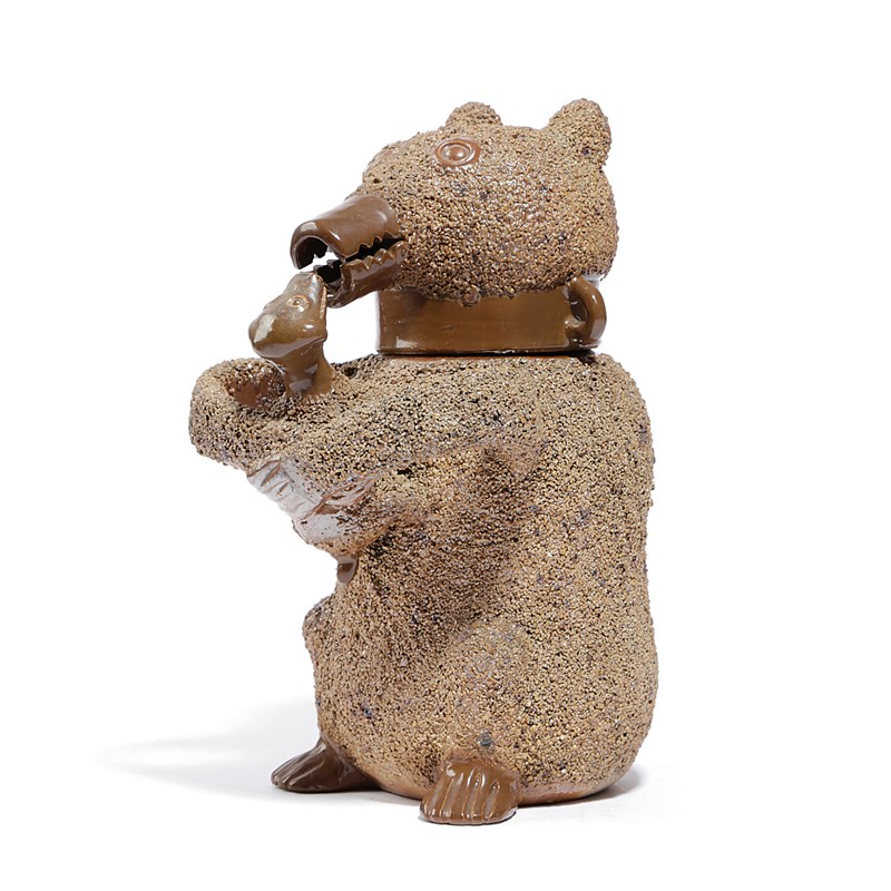 modelled seated on its haunches and clutching a club between his front paws, his fur depicted in crumbled clay, the snout, paws and collar decorated in a brown lustre glaze
