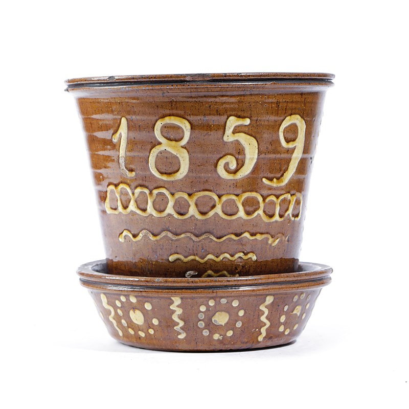 AN EARLY VICTORIAN STAFFORDSHIRE SLIPWARE POTTERY PLANT POT